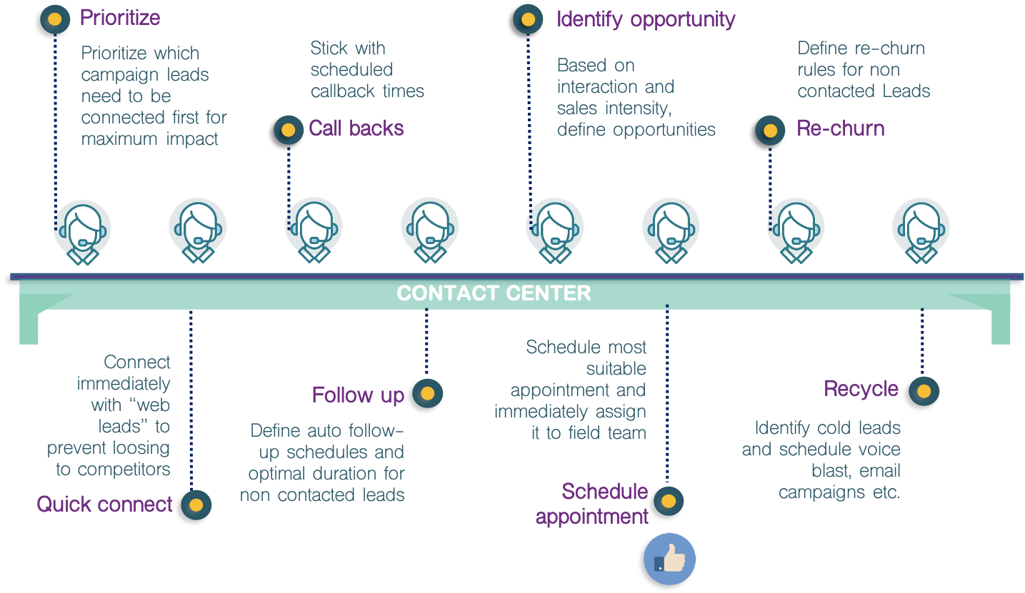 Holistic CRM for Insurance industry, Holistic CRM for Banking industry, Centralised call centre operation management, Online and Direct dales management, Persistency customer engagement , Welcome Management and operations , Customer verification